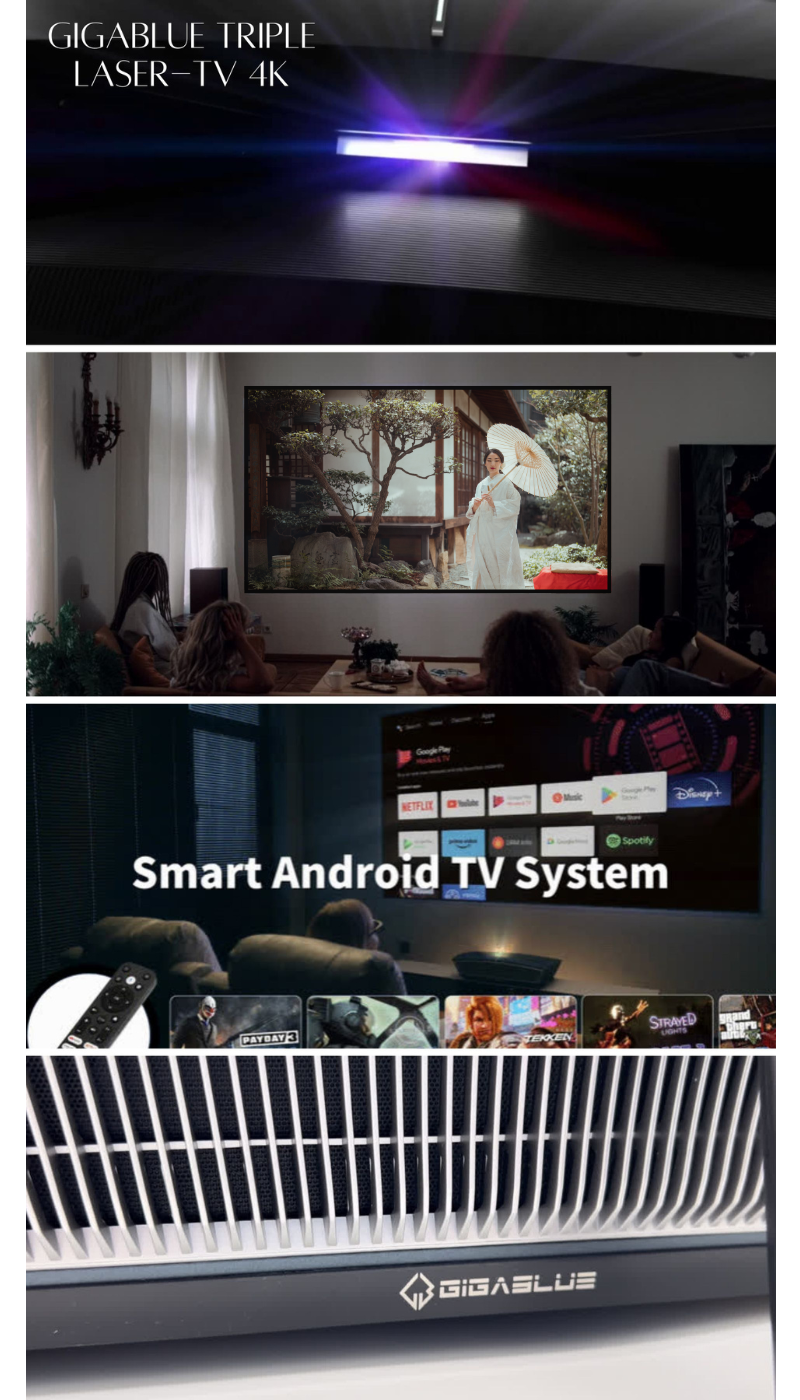 Es ist uns eine Freude, Ihnen unser neuestes Modell vorzustellen – den GigaBlue Triple Laser-TV 4K. Wir sind stolz darauf, Ihnen ein innovatives Fernseherlebnis mit gestochen scharfer 4K-/UHD-Auflösung präsentieren zu können. Tauchen Sie ein in die Welt lebendiger Farben, beeindruckender Kontraste und gestochen scharfer Details. Der GigaBlue Laser-TV 4K vereint erstklassige Bildqualität mit modernster Technologie, um Ihnen ein unvergleichliches Sehvergnügen zu bieten. Entdecken Sie die Zukunft des Fernsehens – willkommen beim GigaBlue Laser-TV 4K.