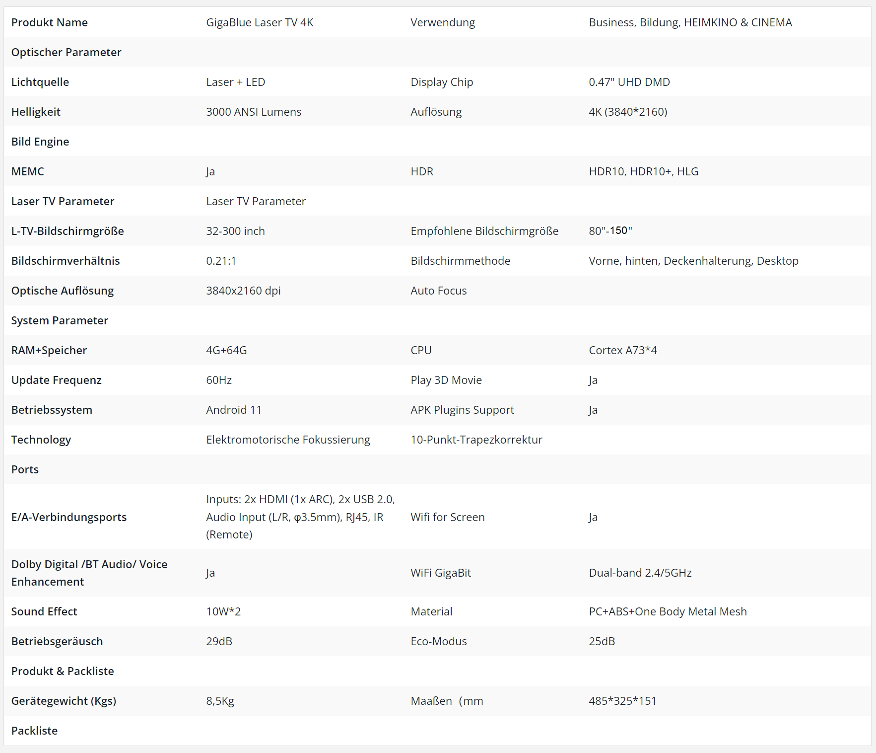 Der Gigablue Laser-TV bietet echte 4K HDR-Auflösung für ein fesselndes Seherlebnis. Mit 8,3 Millionen Pixeln und einem Kontrastverhältnis von 3 Millionen zu 1 liefert er gestochen scharfe Bilder und beeindruckende Farben. Tauchen Sie ein in die Welt der visuellen Brillanz mit dem Heimkino-System, das für Filme, Serien und Spiele optimiert ist.