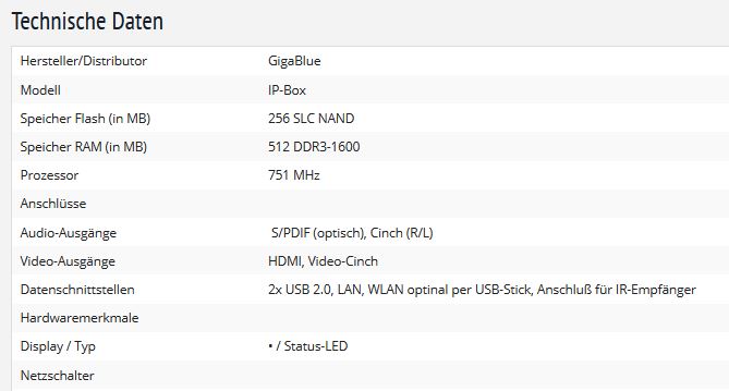 Sie besitzen eine Gigablue-Box im Haushalt und möchten gerne in einem anderen Raum ebenfalls die volle Funktion eines Gigablue Gerätes nutzen; jedoch ohne weiteren Antennenanschluss und möglichst kostengünstig? Mit einer Gigablue IP Box können Sie es ganz bequem umsetzen. Ihre Signale erhält Sie via Streaming von anderen Gigablue-Geräten, mit denen sie über das heimische Netzwerk kommuniziert. Neben dem vollwertigen TV Empfang, bietet die IP Box alle weiteren Vorteile eines Linux Gerätes. Mit einer Prozessorleistung von 751MHz, einem Arbeitsspeicher von 512MB und einem Flashspeicher von 128MB können sämtliche passenden Plugins (Erweiterungen) uneingeschränkt genutzt oder Mediaplayerfunktionen mittels des USB Anschlusses genossen werden.