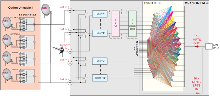 Ihr stehen nicht ausschließlich DVB-S-Signale zur Verfügung. Denn sie besitzt neben 10 DVB-S2/S2X Tuner (Tuner 7-16) auch 6 Multinorm-Tuner (Tuner 1-6), die für den Empfang von DVB-S2/S2X/C/T/T2-Signalen geeignet sind. Zusätzlich können bis zu 16x MPTS (SPTS)-Signale in der lamina empfangen und ebenfalls für die Generierung des Multiplex-Streams bereit gestellt werden.