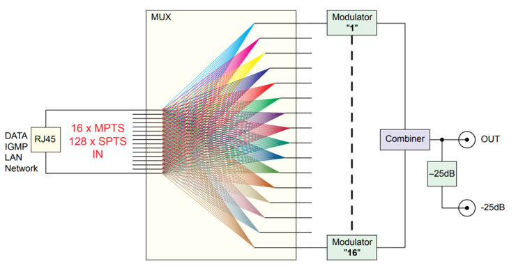 Mit unserer STIM 1916 CT können Sie bis zu 128 SPTS-Datenströme und 16 MPTS-Datenströme (max. Gesamt-Eingangsrate 900 MBit/s) in 16 Multiplexe umsetzen und somit als 16 QAM- oder 16 COFDM-modulierte Kanäle ausgeben.