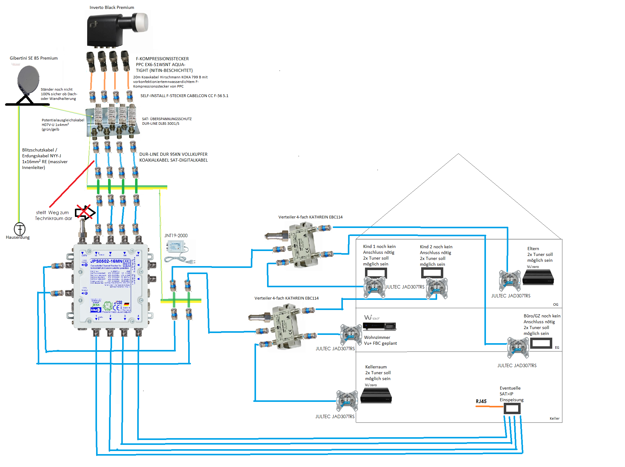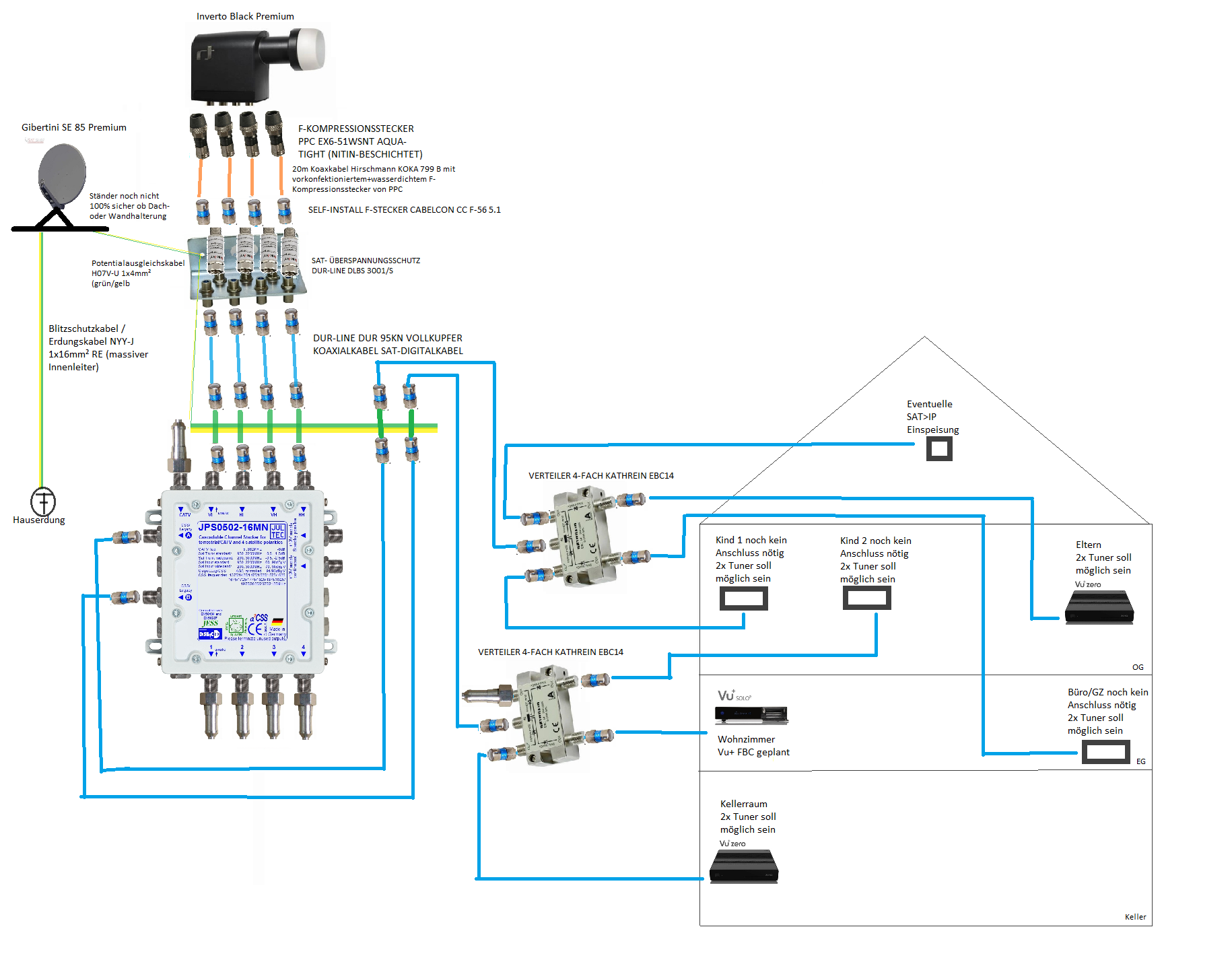 Ein Fehler noch ... die beiden 4-fach Verteiler dürfen KEINE sein mit Dioden ("Diodenentkopplung") drin, also keine Kathrein EBC14. Da müssen Verteiler rein ohne Diodenentkopplung, also dort jeweils der
