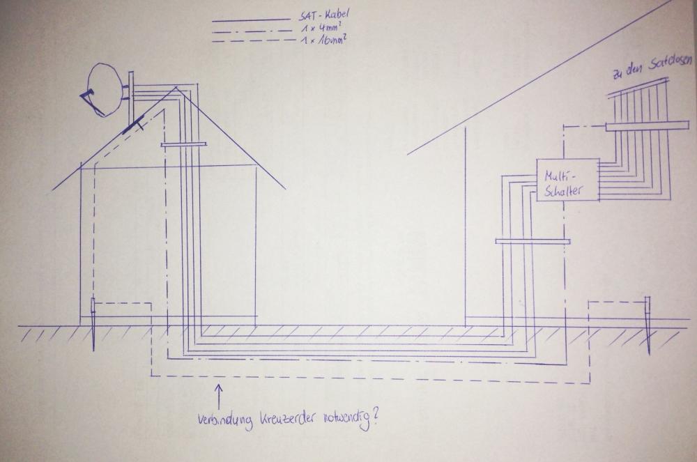 3. muss das PA-Kabel für den Potentialausgleich rund um den Multischalter vom geerdeten Mast abgenommen werden (also GENAU von dem Punkt wo am Antennenmast auch das Erdungskabel 1x16mm angeschlossen wird)
