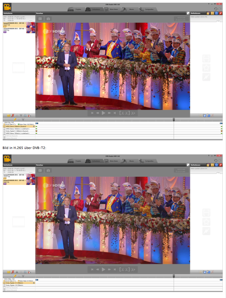 Unter diesem Link könnt Ihr Euch eine 120MB große ZIP Datei mit zwei 50MB TS Dateien (DVB-T2 und DVB-S2) von der Sendung "Mainz bleib Mainz, wie es singt und lacht" vom 9.2.2018 und allen hier nachfolgenden Bildern in hoher Auflösung laden:
