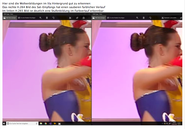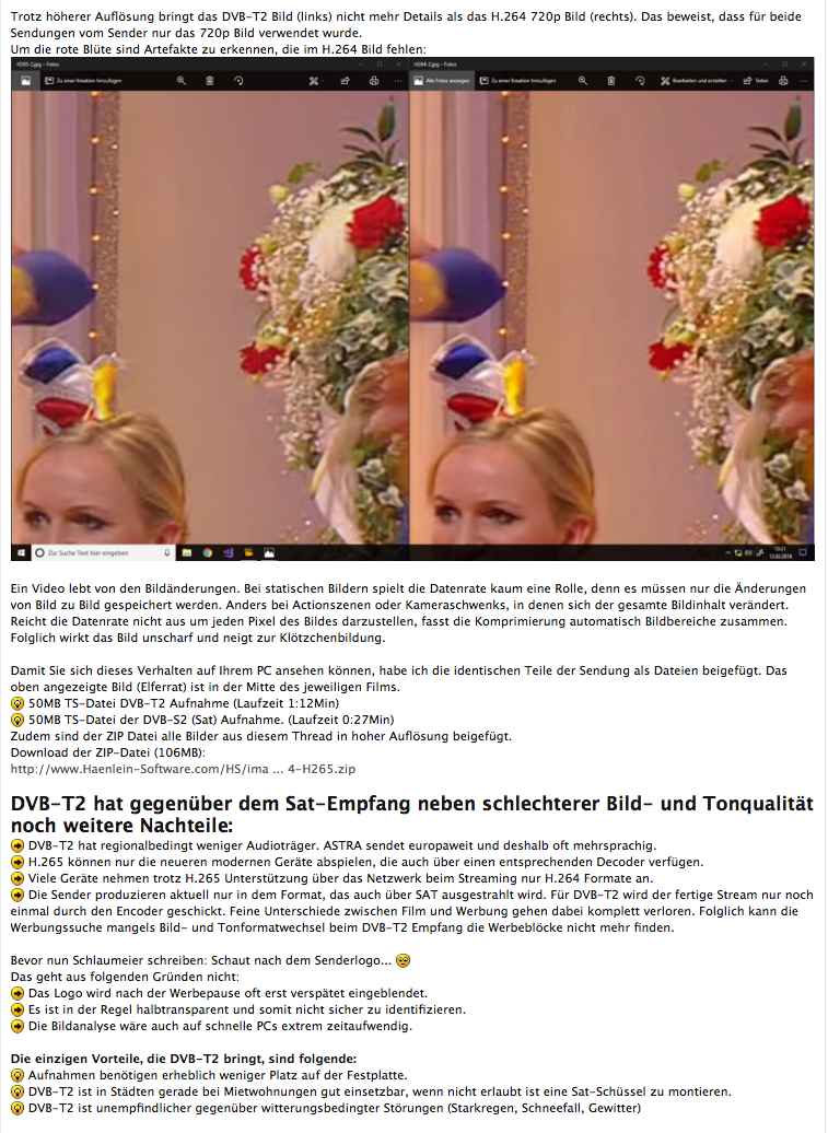 in meinem ersten Test hatte die ZDF HD Sendung "Mainz bleib Mainz, wie es singt und lacht" vom 9.2.2018 auf SAT mit der über DVB-T2 verglichen. Hier findet Ihr alle Bilde und die Dateien zu den Aufnahmen: