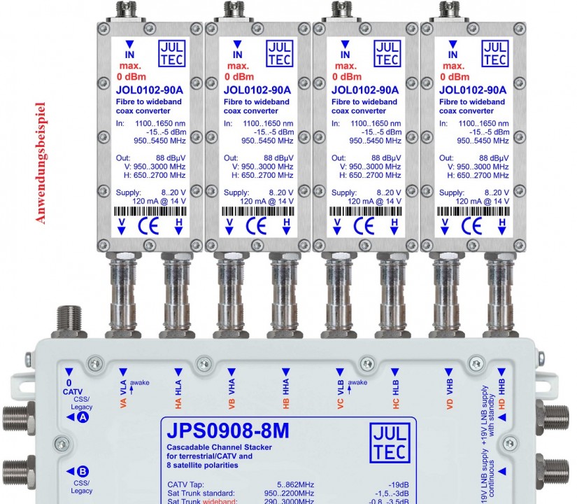 WICHTIG/HINWEIS: Bei der Breitband-LNB Zuführung ist nur Einkabel-Betrieb / CSS (Geräte der Jultec JPS- und JRS-Serie) möglich, kein Legacy-Modus (bei Geräte der JPS-/JRS-Serie mit extra Legacy-Ausgängen - "+4T Varianten" - sind dann NUR die Einkabelausgänge nutzbar) ! Ebenso steht die Jultec Legacy-/CSS-Kombifunktion dann nicht zur Verfügung.