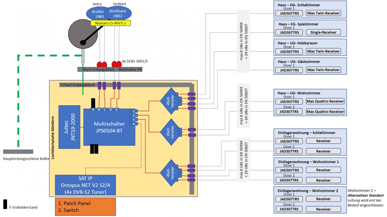 Beitrag mit Jultec JPS0502-8T (anfangs nur ein JRS0502-4T, dann aber geändert wegen zu wenig UB-Versorgungen von diesem) wo eine Versorgung via nur 2 Koaxkabeln erklärt wird + Möglichkeit zur Erweiterung auf 2. Satelliten mit diesem Aufbau.