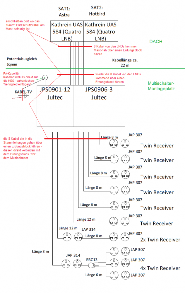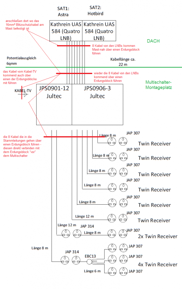 Das mit den Antennendosen hatten wir schon per Telefon durchgesprochen und das haben sie schon richtig eingetragen in ihrer Zeichnung (die habe ich übrigens von ihrem .pdf umgewandelt in eine Grafik das sie direkt angezeigt wird !). Dazu aber auch bitte den oben verlinkten Parallelbeitrag mal noch beachten, da wird noch mehr dazu gesagt (wie auch zur vorgeschriebenen Erdung der Anlage => dazu aber auch noch ein zusätzlicher Link - Erdung Satellitenanlage / Antennenmast + Potentialausgleich - habe dazu aber auch mal ihre Zeichnung etwas modifiziert ---- ACHTUNG ! Das vom Kabel-TV kommende Kabel ist/sollte jetzt schon vom Kabelmonteur über eine Erdungsschiene geführt sein und diese Erdungsschiene direkt mit der Haupterdungsschiene (HES) im Keller verbunden sein .... diese Verbindung zur HES bitte lösen und auch die Erdungsschiene auf welche das Kabel-TV Kabel gelegt ist mit dem Punkt auf dem Antennenmast führen wie die anderen Kabel ! Sonst kommt es zu einer Schleifenbildung was zu Problemen führen kann *1).