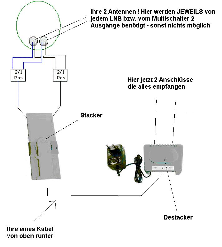 4. sie beide Augänge dieser DiSEqC- Schalter über das Stacker-Destacker-System (mit den "Stacker") über das eine vorhande Kabel nach unten in ihre Räume führen und dort über den "Destacker" auf 2 Kabel auftrennen
