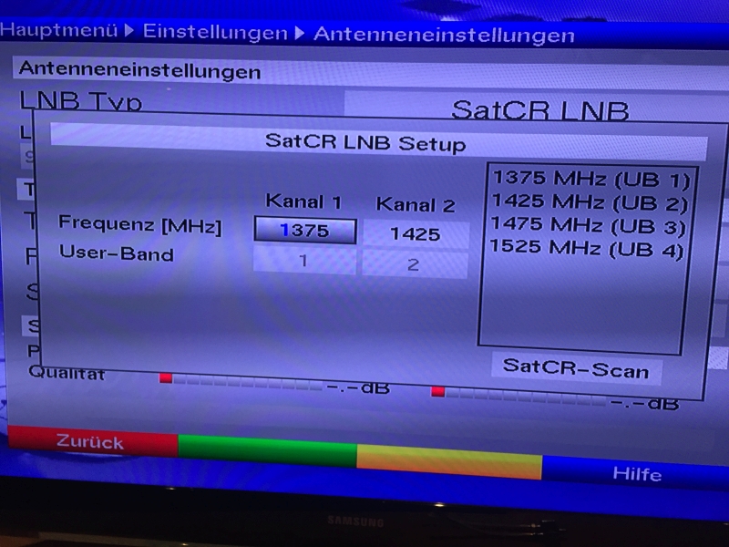 Dann in den Konfiguations-menues der beiden Schaltpositionen für Astra und Hotbird als LNB-Typ jeweils SatCR. Zudem dort jeweils im SatCR setup als Kanal 1: 1375 MHZ (Band1) und Kanal 2: 1425 MHZ (Band2).
