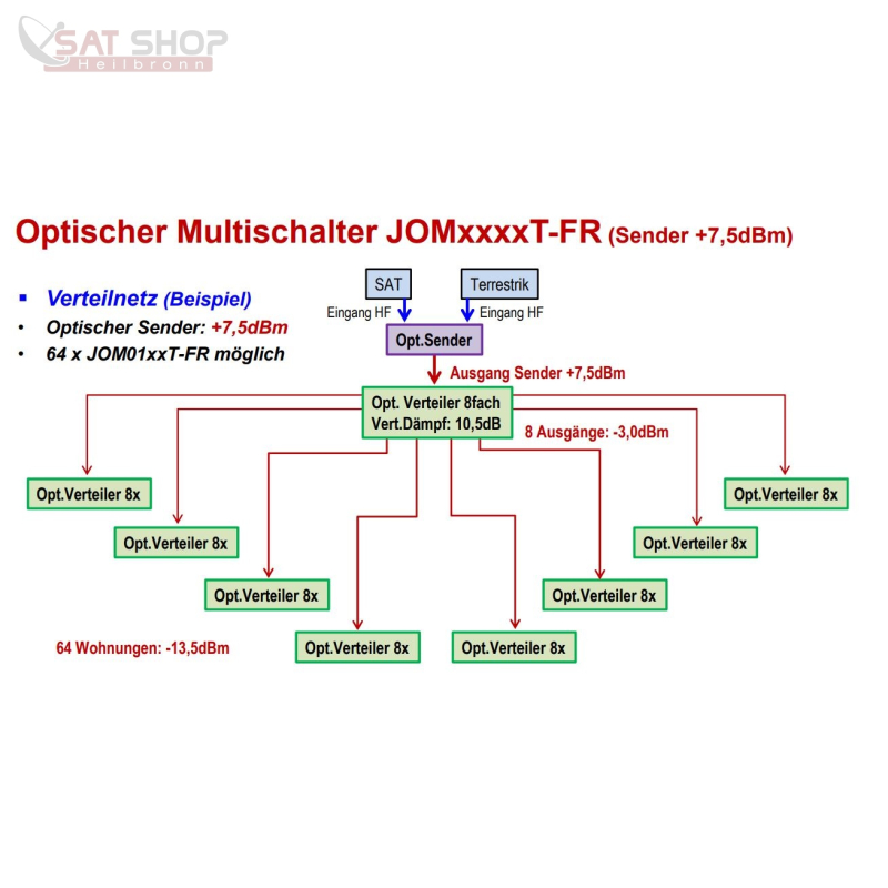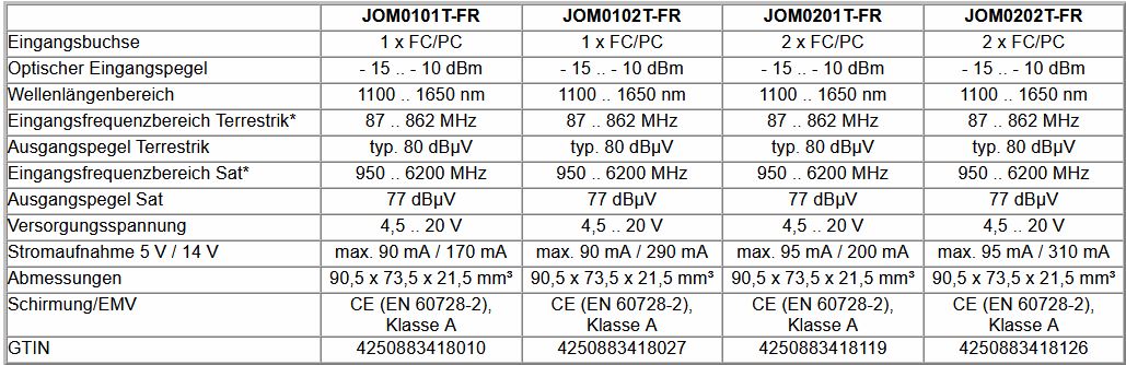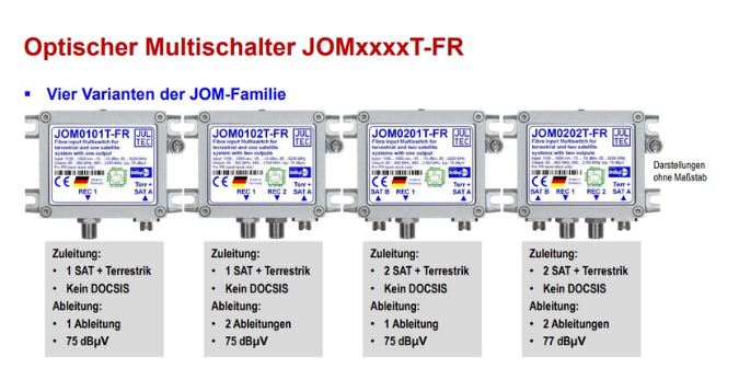 Bei der JOM-Geräteserie handelt es sich um Sat-Medienkonverter mit Glasfasereingang und Legacy-Ausgang. Die Geräte sind äußerst kompakt, so dass sie sich leicht in Medienverteiler integrieren lassen. Bei Nachrüstung können sie unauffällig in der Wohnung platziert werden.