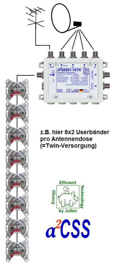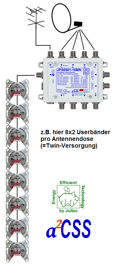 Am Ausgang stehen 16 Userbänder für die Versorgung von 16 Empfangsteilen (z.B. 8 Twin-Receiver oder 4 Quad-Receiver oder 2 Octo-Receiver) zur Verfügung. Alternativ kann ein herkömmlicher Satellitenempfänger (DVB-S/S2) mit 14V/18V/22kHz-Steuerung betrieben werden (automatische Umschaltung / Legacy-/CSS-Kombifunktion).