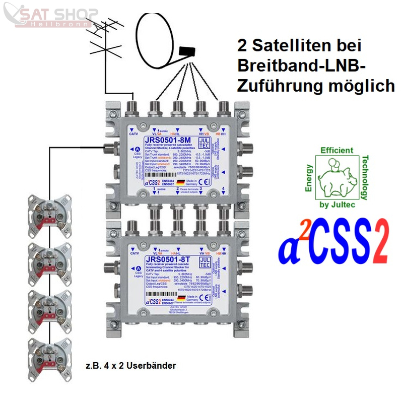 Sat-Anlage mit Jultec JRS0502-8M (2x8 UB) und JRM0508M (8 Legacy) Kaskade