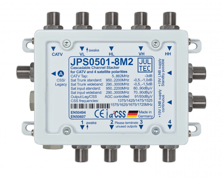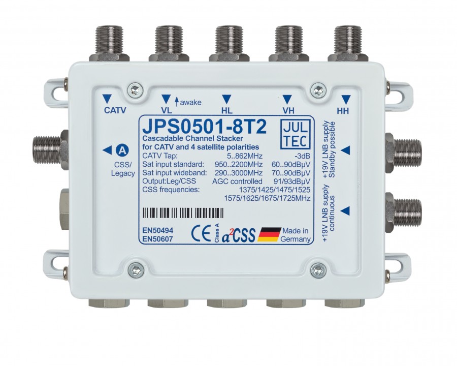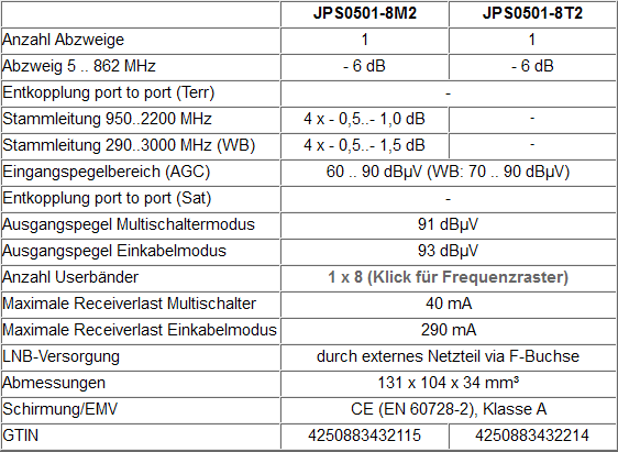 Bei den Geräten JPS0501-8M2 und JPS0501-8T2 handelt es sich um Einkabelmultischalter für ein Satellitensystem (im Breitbandmodus zwei Sat-Systeme). Das Gerät versorgt sich komplett aus den angeschlossenen Empfangsgeräten, für die Speisung des LNBs ist ein externes Netzteil erforderlich (z.B. JNT19-2000).