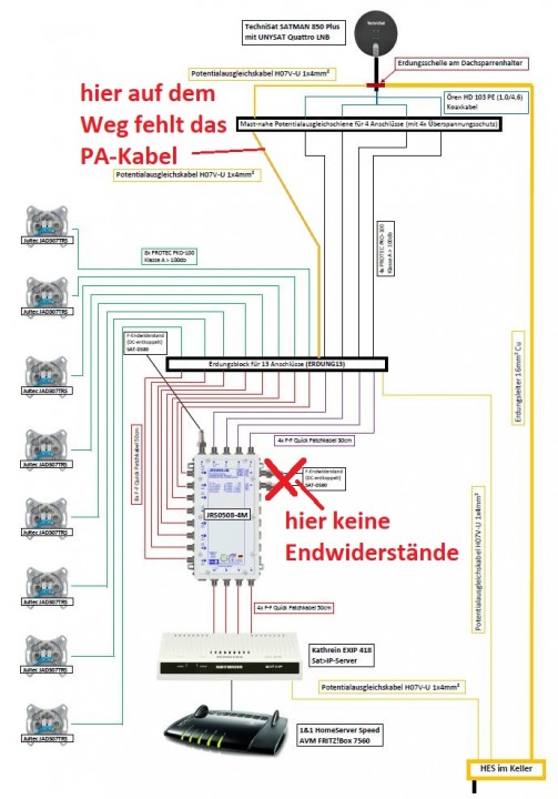Da habe ich eigentlich nur einen Fehler gefunden, es fehlt das PA-Kabel parallel zu den Koaxkabeln vom Quattro-LNB kommend runter bis zum Multischalter-Aufbau.... das muss da mit rein. In der Zeichnung in der Anlage eingezeichnet und gekennzeichnet.