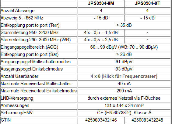 Bei den Geräten JPS0504-8M und JPS0504-8T handelt es sich um Einkabelmultischalter für ein Satellitensystem (im Breitbandmodus zwei Sat-Systeme). Das Gerät versorgt sich komplett aus den angeschlossenen Empfangsgeräten, für die Speisung des LNBs ist ein externes Netzteil erforderlich (z.B. JNT19-2000).