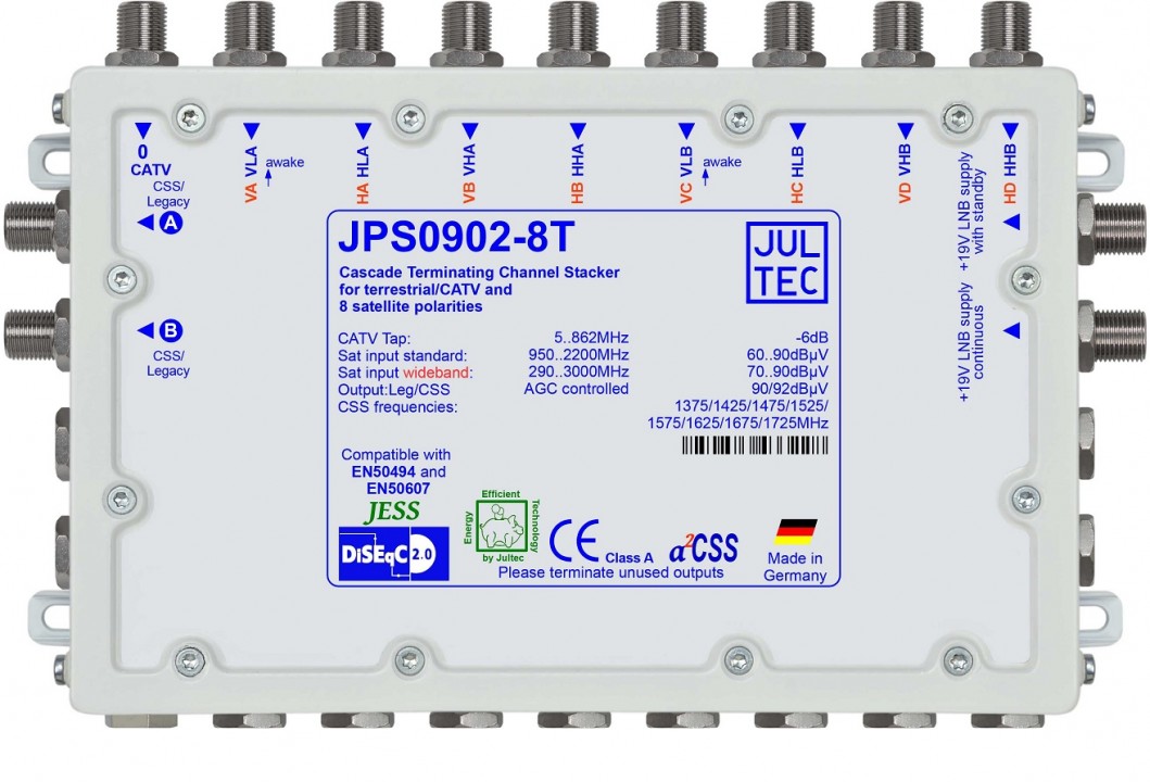 Der JPS0902-8M hat Stammleitungs-/ Kaskadenausgänge für die Sat-ZF, der JPS0902-8T ist komplett terminiert (als Einzel- oder Abschlussgerät). Der Strombedarf pro Receiver erhöht sich nicht durch Kaskadierung. Beide Gerätevarianten sind auch für die Verteilung von Kabelfernsehen inklusive DOCSIS 3 geeignet.