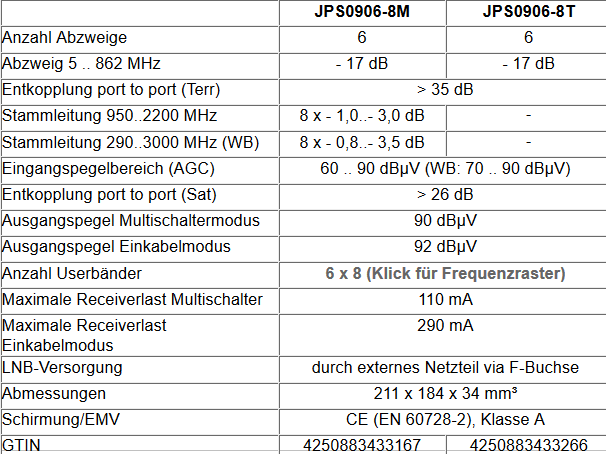 Bei den Geräten JPS0906-8M und JPS0906-8T handelt es sich um Einkabelmultischalter für 2 Satellitensysteme (im Breitbandmodus vier Sat-Systeme). Das Gerät versorgt sich komplett aus den angeschlossenen Empfangsgeräten, für die Speisung des LNBs ist ein externes Netzteil erforderlich (z.B. JNT19-2000).