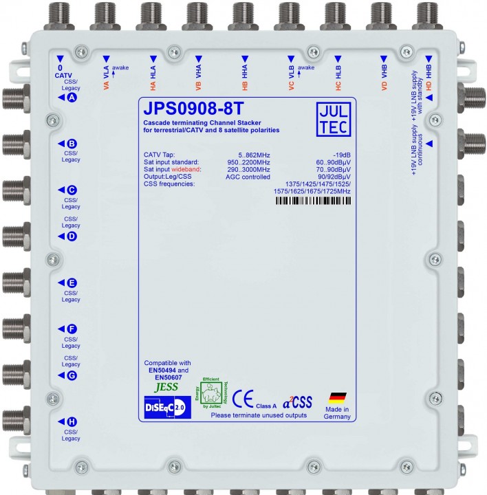 Der JPS0908-8M hat Stammleitungs-/ Kaskadenausgänge für die Sat-ZF, der JPS0908-8T ist komplett terminiert (als Einzel- oder Abschlussgerät). Der Strombedarf pro Receiver erhöht sich nicht durch Kaskadierung. Beide Gerätevarianten sind auch für die Verteilung von Kabelfernsehen inklusive DOCSIS 3 geeignet.