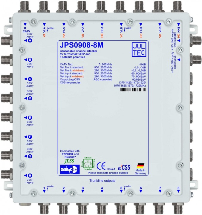 Jultec JPS0908-8M/X (Gen 2) Unicable EN50494 Einkabelumsetzer für 2 Satelliten (8x8 UBs/IDs/Umsetzungen- a²CSS2 Technologie)