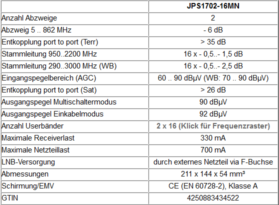 Beim JPS1702-16MN handelt es sich um einen Einkabelmultischalter für vier Satellitensysteme (im Breitbandmodus acht Sat-Systeme). Das Gerät wird mit dem Netzteil JNT19-2000 ausgeliefert, welches für den Betrieb benötigt wird. Das LNB wird ebenfalls aus diesem Netzteil gespeist.