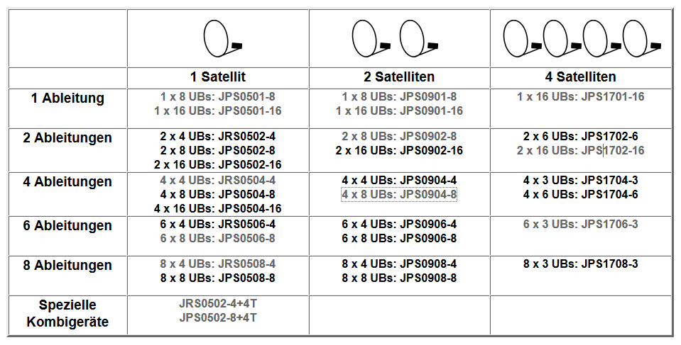 Wie schon gesagt, ich sehe nur max. 2 von den neuen Schaltern nebeneinander und auch in der Beschreibung max. A, B, C und D (4 Satelliten). Wenn man bei den Inverto-MS über Breitband-LNBs versorgen würde wäre der Multischalter dahinter auch nicht mehr einsetzbar, den der könnte mit den Breitband-LNBs gar nicht umgehen (wie auch bei Jultec die JRM-Serie, Legacy-Multischalter, nicht mit Breitband-LNBs arbeiten könnte -- auch das im Hinterkopf behalten, dazu folgt noch mehrGompf hat geschrieben:Bei den Invertos gefällt mir das ich unter Umständen die Terratecs (nicht Unicable fähig) beibehalten koennte, indem ich einen regularen MS kaskadiere durch Verwendung von entsprechend vielen Invertos und nicht einsetzen von Wideband LNBs (was bei Inverto wohl unter akzeptablen kosten gehen würde).