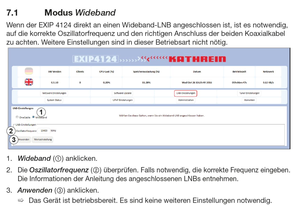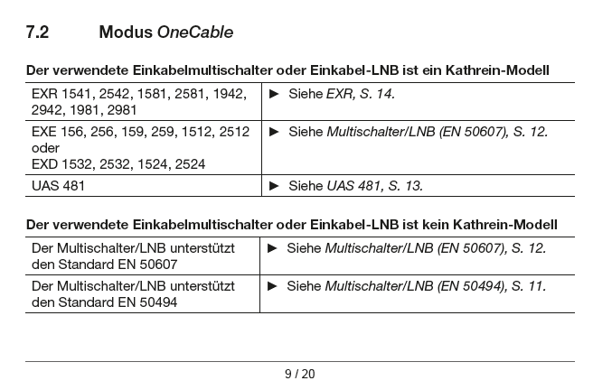 Die Kombifunktion funktioniert nicht, wenn spezielle Einkabel-Antennensteckdosen mit Schutzfunktion verwendet werden (z.B. JAP-Serie), da diese die Legacy-Steuerbefehle blockieren. In diesem Fall ist nur der Einkabelmodus nutzbar. Weiterhin ist diese Funktion bei einer Breitband-Sat-Zuführung (Breitband-LNB Versorgung) auch nicht verfügbar.