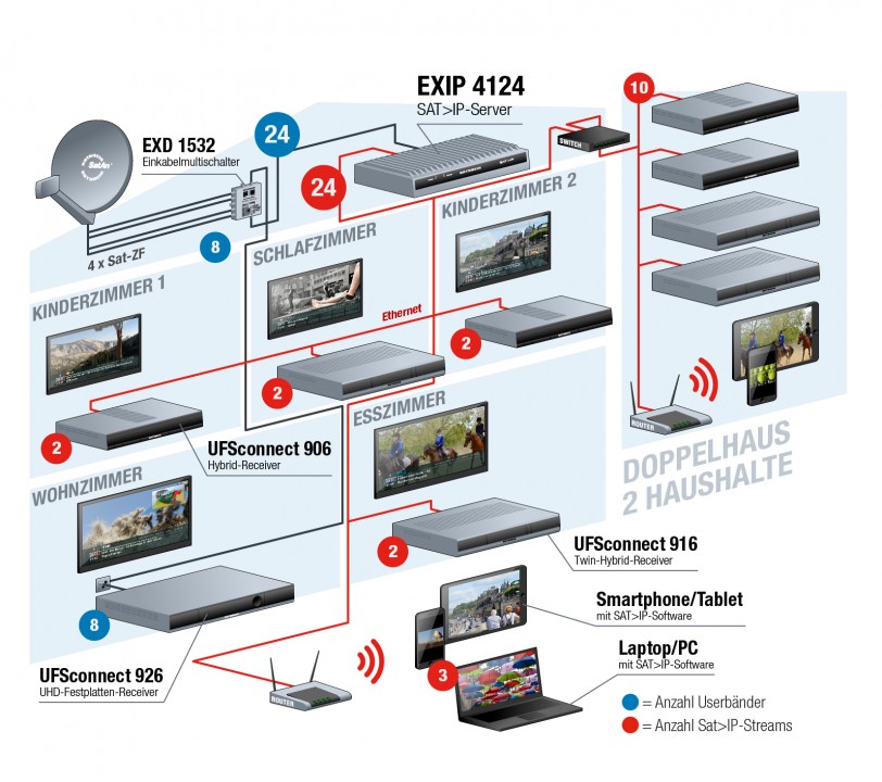 Über die zweite Leitung zu den Receivern wuerde ich DVB-C verteilen und über die Unicable-Leitung DVB-T. Sprich es gibt zwei Dosen pro Leitung. Uebr SAT>IP habe ich auch schon nachgedacht, aber das stört mich das die vTuner der VU+ Boxen wohl in der Anzahl limitiert sind.
