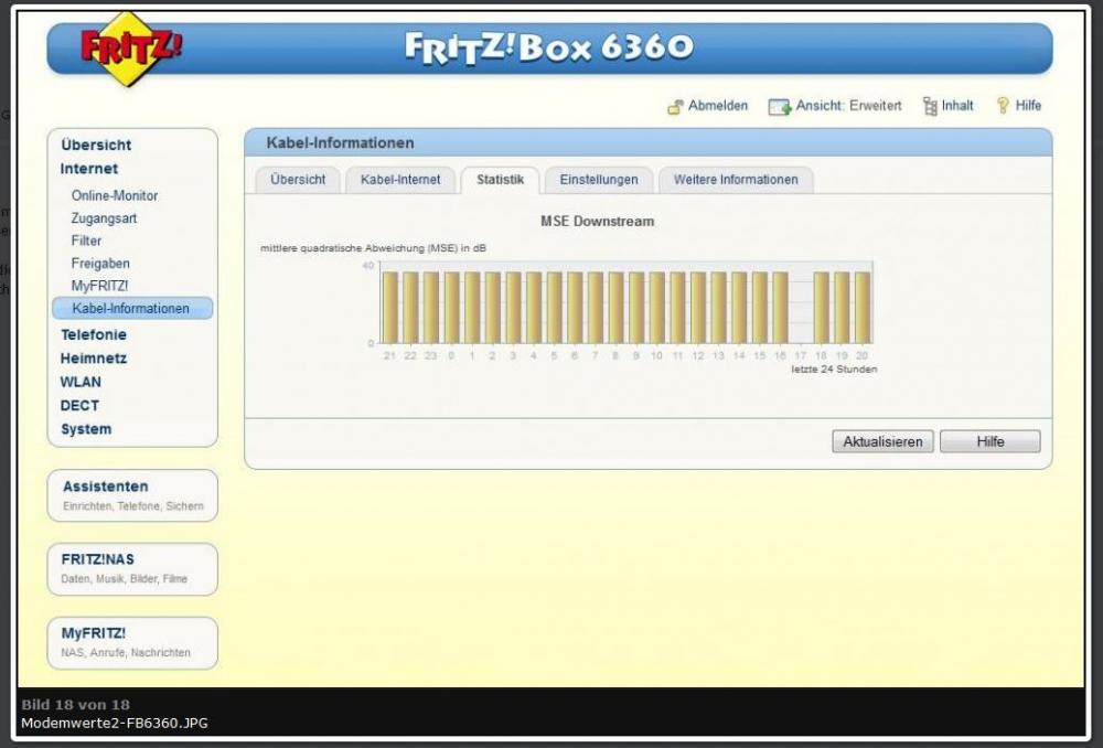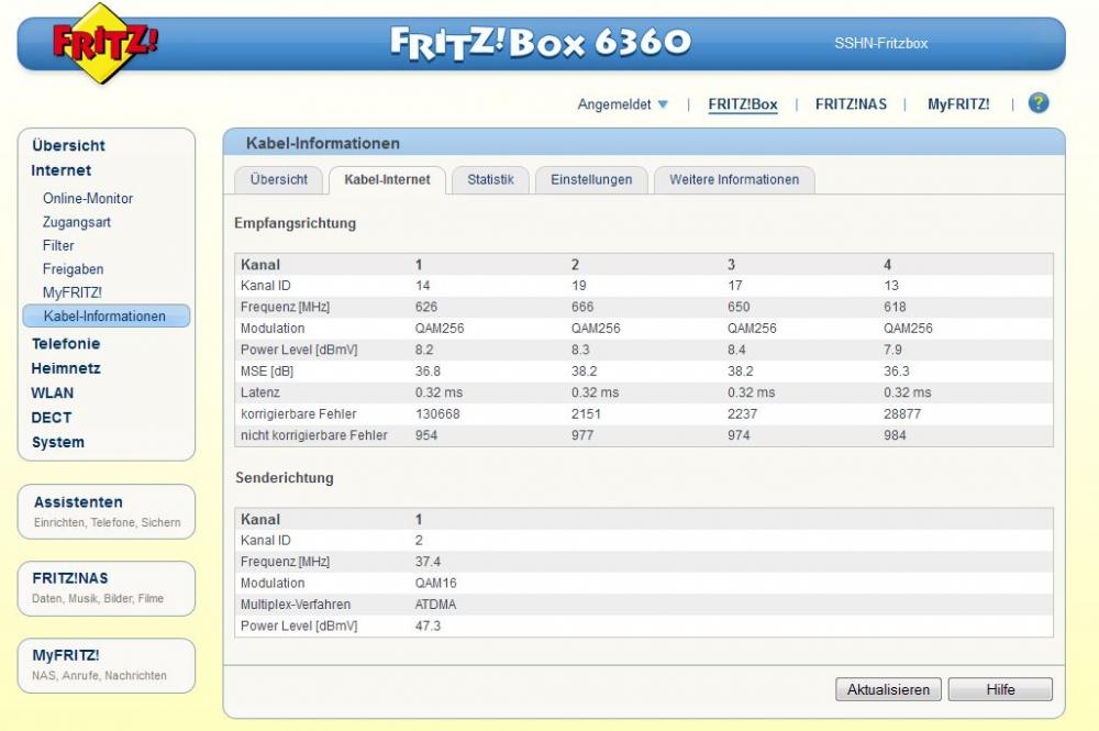 So, jetzt wurde ich durch ihren gerade laufenden 2. Beitrag ( Unicable Umrüstung 40 Jahre alte Kabel ) nochmal von ihnen auf diesen Beitrag Aufmerksam gemacht und habe jetzt zwar immer nicht die Ahnung von der Modem-Technik, kann ihnen aber jetzt mittlerweile Screenshots von meiner Kabel-Fritzbox 6360 neu installierten Box zeigen (gerade vor ein paar Tagen installiert - könnte gerade durchdrehen damit da der S0-Bus auf mein ISDN-Telefon durchgeschliffen ist und das aber immer aussteigt .... kann Anrufe immer empfangen, aber raus geht nichts da immer nur am Siemens Tel steht "Bitte prüfen Sie die Telefonverbindung" --- rufe ich mich dann selbst an kann ich auch die nächsten paar Minuten raus telefonieren ... aber anderes Thema)....