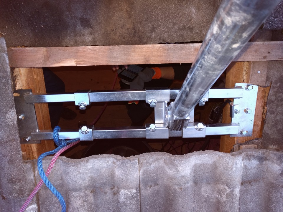 1. Auf dem Dachboden ist die 1. PA-Schiene installiert. Dort treffen sich die schwarzen UV-resistenten Koax-Außenkabel mit den weißen Koax-Verlegekabeln, die in den Keller führen. Diese 1. PA-Schiene ist über zwei grün-weiße Kabel mit der 2. PA-Schiene und mit der Masthalterung verbunden.