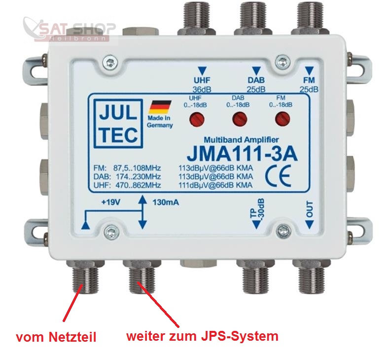 2. muss die Terrestrik (UKW) vor dem Einspeisen in den Unicable-Multischalter verstärkt werden, sonst kommt da dahinter nicht mehr viel davon raus. Dafür kann man z.B. den Jultec JAC110 oder den Jultec JMA111-3A verwenden die beide kein extra Netzteil benötigen, sondern das NT vom JPS-Schalter "mit verwenden" können.