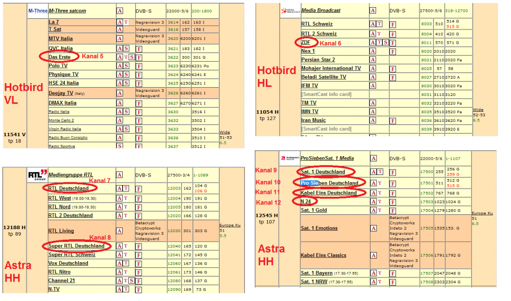 Besonderheit hier ist das ARD + ZDF wegen dem Empfang in Griechenland über den Satelliten Hotbird 13 Grad herangezogen wurde und vom Sat1/Pro7 Transponder ganze 4 Programme umgesetzt wurden.