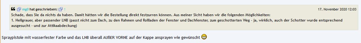 nk57xx hat geschrieben: 25. Februar 2021 09:17War für mich auch sehr seltsam, aber solange ich das PA-Kabel nachziehen kann, was durch ein Leerrohr möglich ist, ist das zumindest "behebbar". Noch ist auch der Dachsparrenhalter nicht montiert, das kommt wohl die Tage noch.