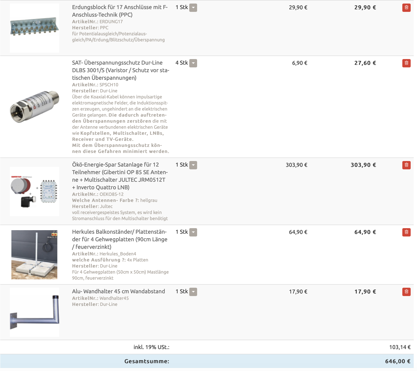 Aber ... sie haben 7 Widerstände nur im Warenkorb, ich zähle 8 (4x Kaskadenausgänge + 3x unbelegte Teilnehmerausgänge + 1x terrestrischer Eingang vom Multischalter)