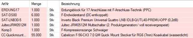 Es fehlt noch das LNB, PA im Schrank und Multischalter. In unserem Haus sind 12 Sat Anschlüsse verbaut. PA Schiene auf dem Dachboden wurde schon mit bestellt (muss nur endlich mal verbaut werden)
