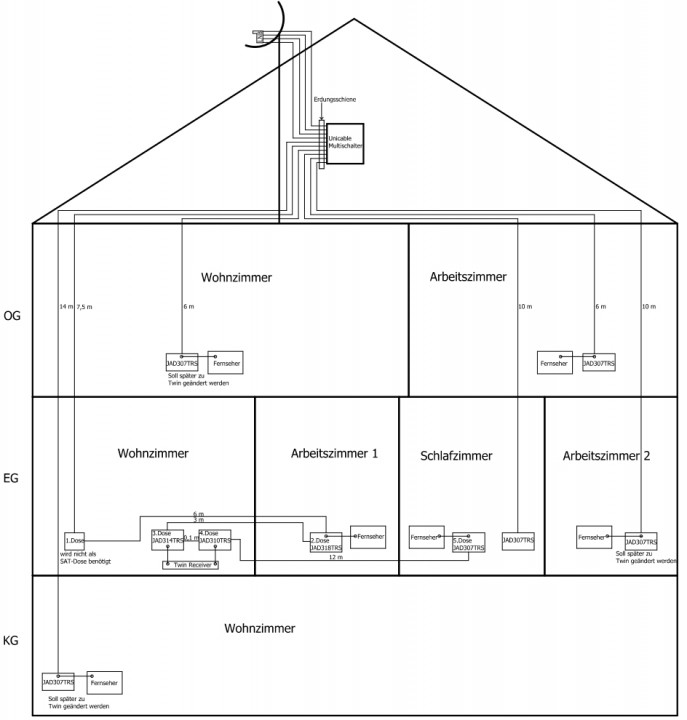 Zum Ist-Stand ist folgendes zu sagen, wir bewohnen ein 3-Familienhaus Bj. 1998 alleine und haben durch Umbaumaßnahmen der Wohnung im Erdgeschoss die Satdosenanzahl erhöht.