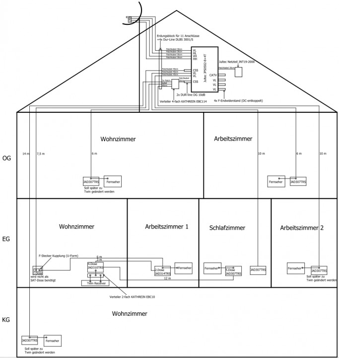 Eine Zeichnung von dem IST-Zustand wäre immer auch gut, auch dort eingezeichnet wo man die Möglichkeit für einen Twin-Tuner mal unbedingt haben möchte bzw. gewünschte nachträgliche, spätere gewünschte Erweiterungsmöglichkeiten mit eingezeichnet. Für eine Erweiterung mit einer 2. Dose später in Reihe wäre ja von Anfang an ein Unicable-Ausgang notwendig. Der könnte auch dank der Jultec Legacy-/CSS-Kombifunktion bis dahin als Legacy verwendet werden.