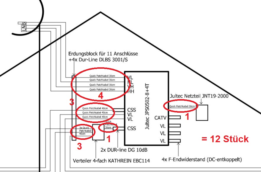 In diesem Fall wären das: JAD318TRS => JAD314TRS = JAD310TRS => JAD310TRS => JAD307TRSobermoss hat geschrieben:In der umgebauten Wohnung im Erdgeschoss haben wir insgesamt 3 Leitungen von der Sat-Schüssel zu 3 Antennendosen.