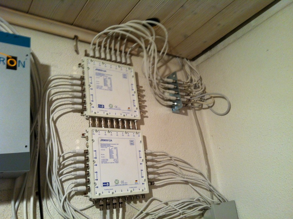 Hier ein Beispiel einer so verbauten Anlage (2x Multischalter Jultec JRM0912A für 2 Satelliten und jeweils 12 Teilnehmerausgängen kaskadiert hintereinander und die letzten Kaskadenausgänge dann weiter zu einer QAM-Kopfstation Polytron QAM12). Über die Multischalter-Ausgänge dann jeweils ein Kabel hier in den Neubau vom Hotel wo jede Antennendose einzeln angefahren wurde und dort somit ein Vollband-Empfang von allen Programmen von 2 Satelliten möglich ist und der Altbau, da noch alte Reihenverkabelung, nur über die Kopfstation versorgt wird).