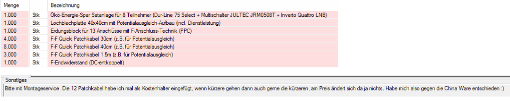 Das ist nichts anderes als ihre Bestellung "Bestellung_User_totti50189_3", da hatten sie diesen vorkonfektionieren Aufbau schon bestellt (Beitrag hier im Forum => Vormontagen- Aufbau im Schaltschrank incl Potenzialausgleich ). Nur das man das nicht in einen Schaltschrank einbauen darf da dieser Schaltschrank schon direkt mit der HES für dessen Potentialausgleich verbunden ist und man sich so eine Schleife rein holt wenn der Potentialausgleich der Satanlage (wenn diese im Nicht-Blitz-geschützten Bereich installiert ist) schon am geerdeten Antennenmast vorgenommen wurde => Erdung Satellitenanlage / Antennenmast + PotentialausgleichMichoa hat geschrieben:Bietet ihr auch Montage auf eine Platte für einen 19" Schrank an?