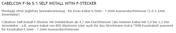 Die sind genau für dieses Kabel, in vielen Beiträgen hier im Forum zu diesem Kabel dazu genannt.Michoa hat geschrieben:Die blauen dürften nicht passen, da das Dielektrikum vom Kabel oben zu dünn ist.