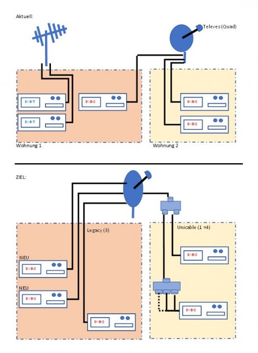 ich lese mich seit geraumer Zeit in die Sat- und Unicable Technik ein, da ich folgende Umrüstung vornehmen möchte (Anlage zeigt grafische Darstellung):
