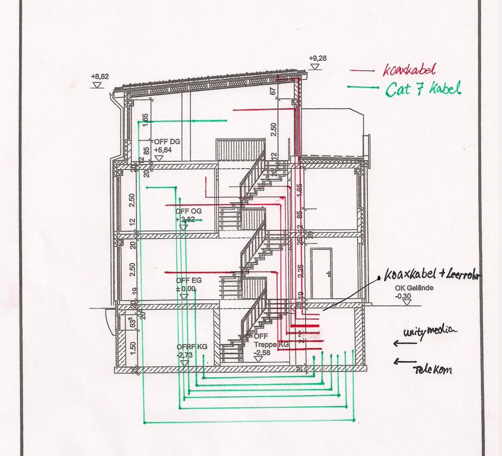 Dach -> Keller mit Leerrohr, restliche Kabel sind fest verlegt und an den Wänden befinden sich jetzt nur Leerdosen.