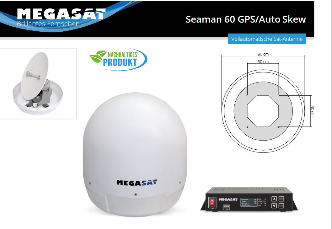 MEGASAT Seaman 60 GPS (Auto-Skew - 3 Teilnehmer/ Anschlüsse) Sat-Empfangsanlage mit automatischem Positionierer (automatisch nachführend in Fahrt/Bewegung)