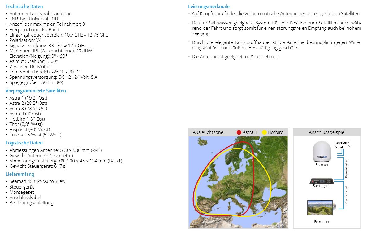 MEGASAT Seaman 45 GPS (Auto-Skew - 3 Teilnehmer/ Anschlüsse) Sat-Empfangsanlage mit automatischem Positionierer (automatisch nachführend in Fahrt/Bewegung)