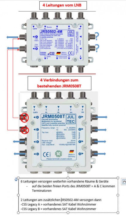 Bei dieser Konstellation: muss ich dann noch die SAT Dosen (für die beiden JRS0502-4M CSS Legacy Anschlüsse) im WZ ändern, oder kann ich Bestehendes (2 Sat-Kabel über bestehende 0815 ...