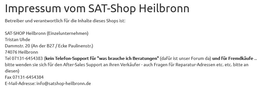 Und hier ein Screenshot der einzige Seite wo wie bei uns auf der Homepage unsere Telefonnummer finden (im Impressum):Tristan Uhde / Satanlagen Onlineshop / SAT-Shop Heilbronn