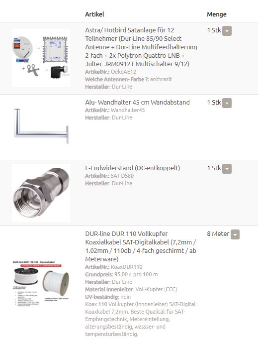 ABER ... das ist nur die Empfangsanlage, also das sind dann weniger als 10% vom Gesamtmaterial in der Anzahl. Den dazu gehört ja noch eine Halterung (keine Ahnung wo das bei ihnen hin soll), passende Koaxkabel + Stecker, Material für Erdung (äußerer + innerer Blitzschutz) etc. etc. etc. etc. etc.