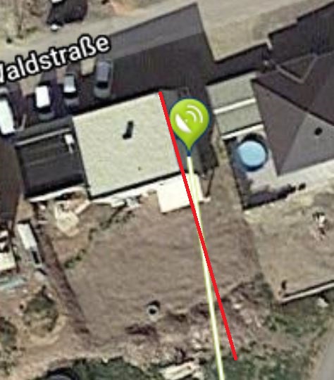 ABER ... ich habe mal in einem Bild die Ausrichtung von einem Satelliten genommen und die Hauswand rot verlängert ... da sieht man doch das diese Wand (Antenne ist ja NICHT genau vorne an der Ecke montiert, sondern noch seitlich an der rechten Wand - Bild als Vorlage -. Und somit wäre die Antenne voll abgeschattet, die Wand wäre im Weg.