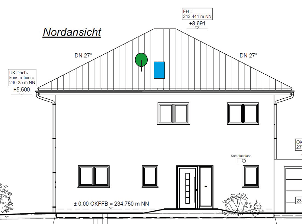 2. ich bin unsicher wo die Satellitenschüssel auf der Nordseite platziert werden kann, damit es auf jeden Fall zu keiner Verschattung kommt. Spontan hätte ich die Anlage grob auf halber Höhe der Nord-Dachfläche gesehen und relativ weit links.